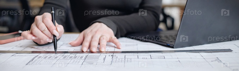 Заголовок Кавказская женщина разрабатывает архитектурные планы с помощью ноутбука и линейки