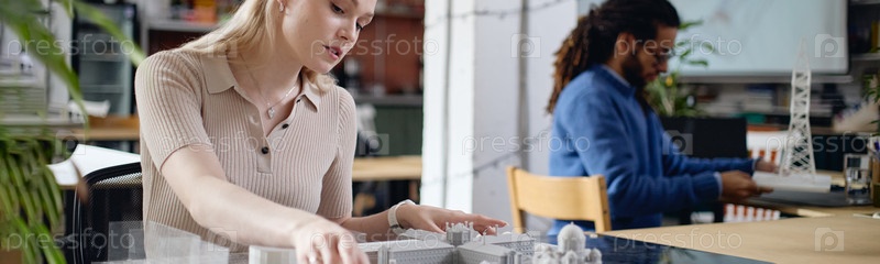Header of Молодая кавказская женщина собирает архитектурную модель в современном офисе
