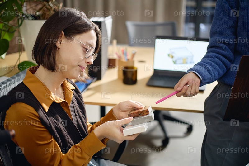 Молодая взрослая белая женщина изучает образцы материала во время офисной встречи