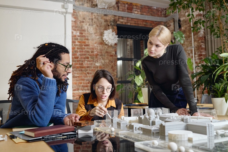 Мультиэтнические молодые взрослые сотрудничают над архитектурной моделью в офисе