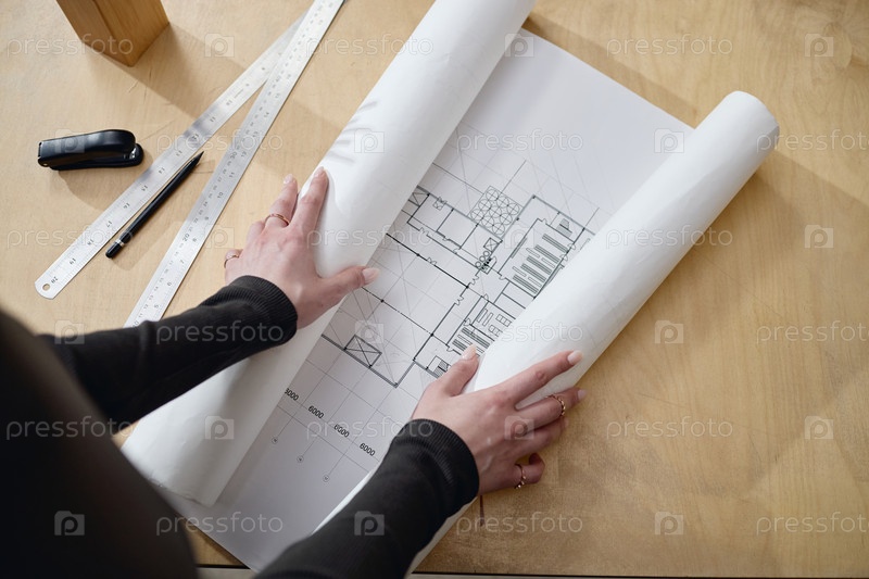 Кавказская молодая взрослая женщина разворачивает архитектурный план на деревянном столе
