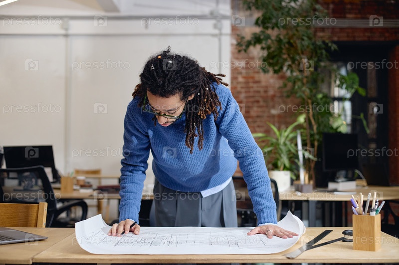 Молодой взрослый чернокожий мужчина просматривает архитектурные планы в современном офисе