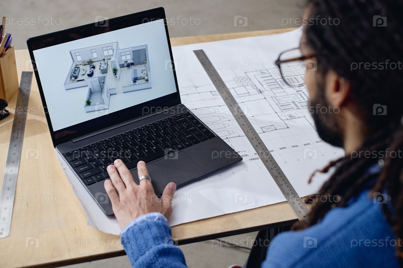 Чернокожий мужчина средних лет рассматривает архитектурный план этажа на экране ноутбука