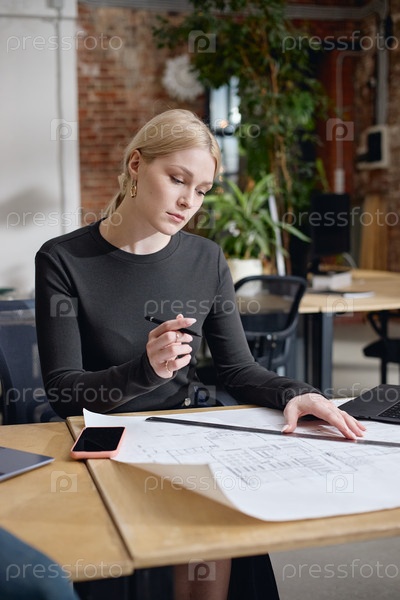 Молодая взрослая белая женщина просматривает архитектурные чертежи в офисе
