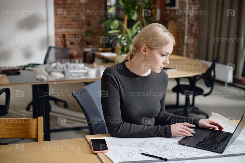 Молодая взрослая белая женщина работает на ноутбуке с архитектурными чертежами