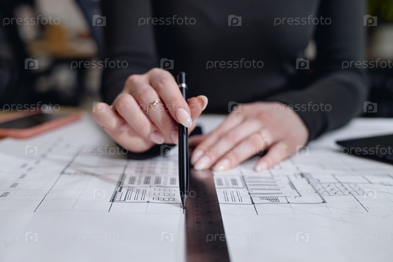 Молодая взрослая белая женщина рисует архитектурные планы с помощью линейки и ручки