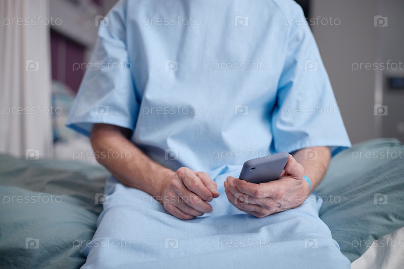 Мужчина средних лет использует смартфон, сидя в больничной кровати