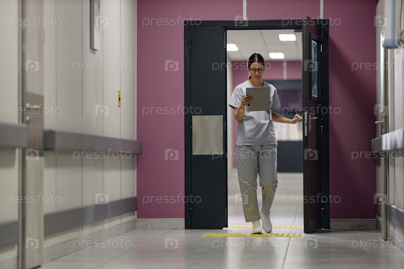 Молодая взрослая женщина, входящая в сосудистый центр коридор просмотра диаграммы пациента