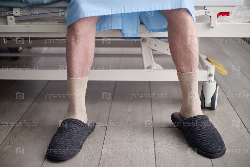 Мужчина в компрессионных носках сидит на больничной койке Senior