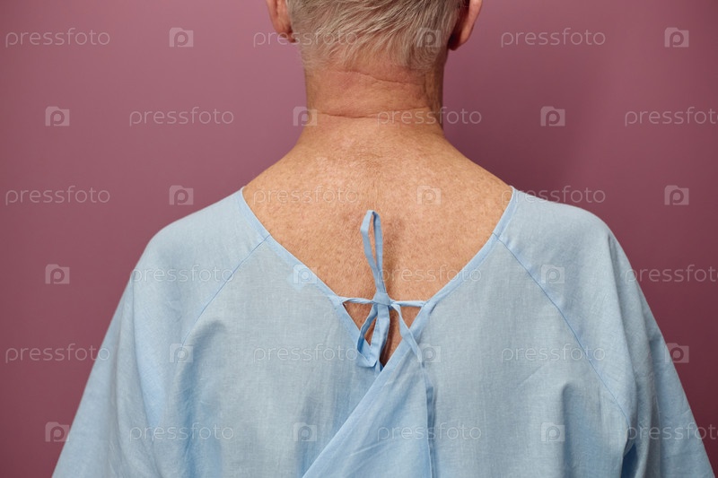 Старший мужчина, носящий больничный халат и ожидающий сосудистого обследования