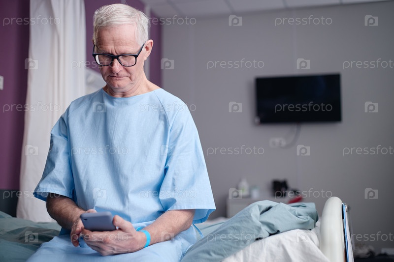 Мужчина использует смартфон, сидя на больничной койке в Васкулярном центре