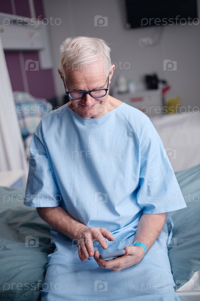 Пожилой мужчина использует смартфон во время ожидания в больничном отделении