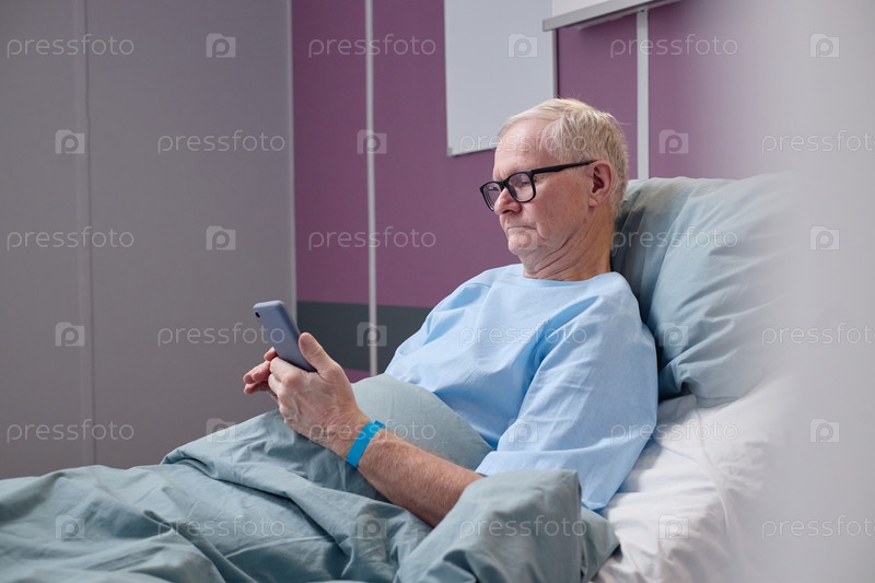 Мужчина, использующий смартфон во время отдыха в больничной постели в Васкулярном центре