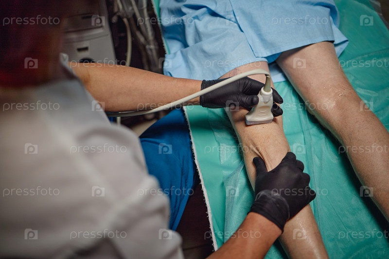 Мужчина среднего возраста проходит ультразвуковое обследование ног в сосудистом центре