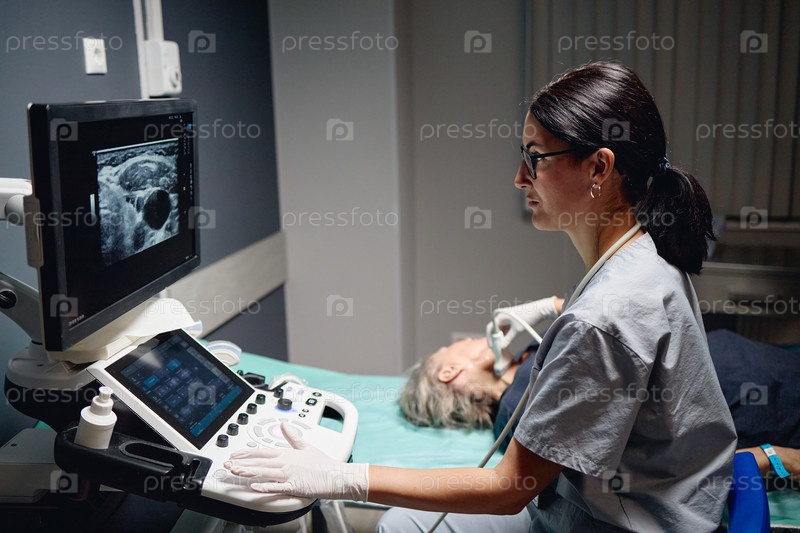 Медицинская женщина среднего возраста, выполняющая ультразвуковое обследование