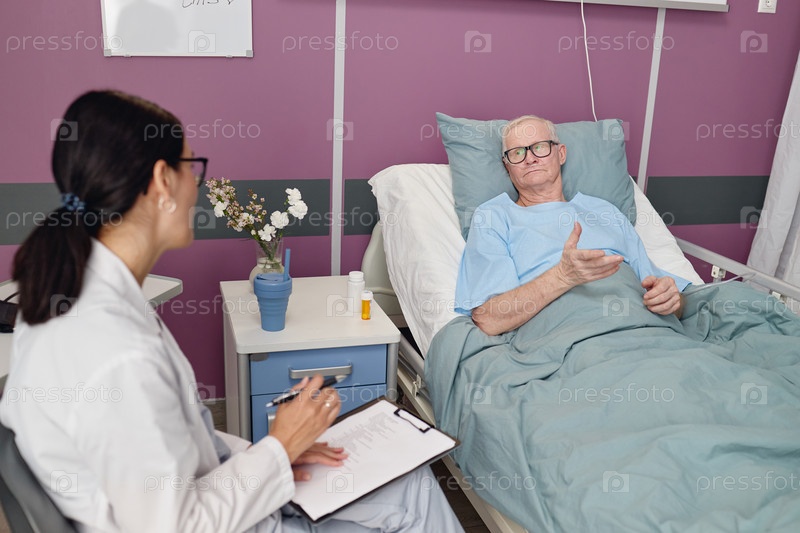 Мужчина обсуждает проблемы со здоровьем с женщиной-врачом в старшей больнице
