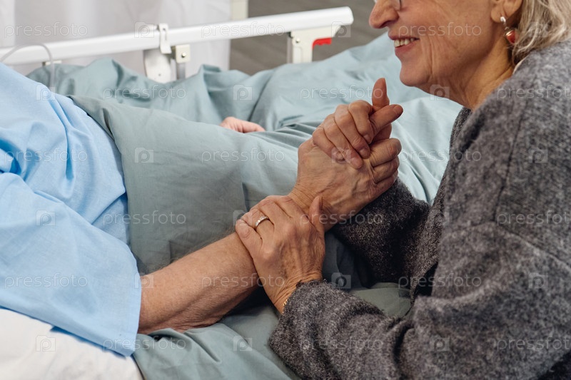 Старшая женщина держит руку старшего мужчины в больничной кровати