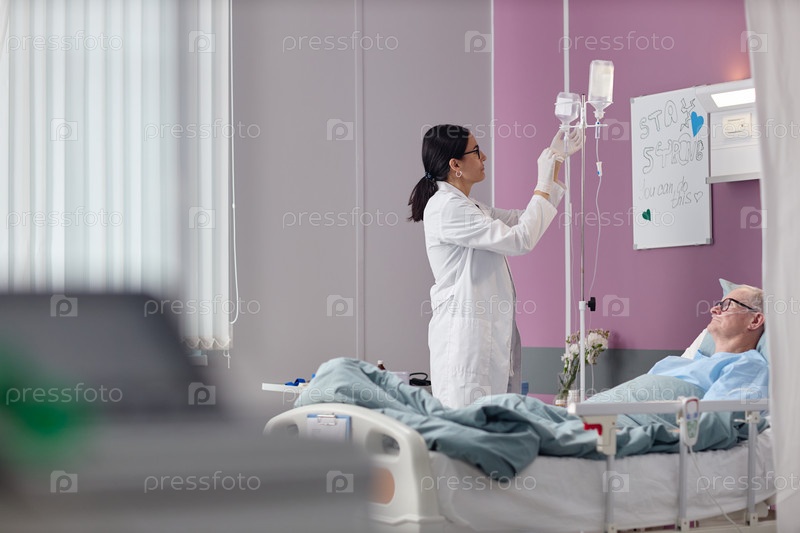 Молодой взрослый врач-женщина, регулирующий IV капельку для старшего мужчины