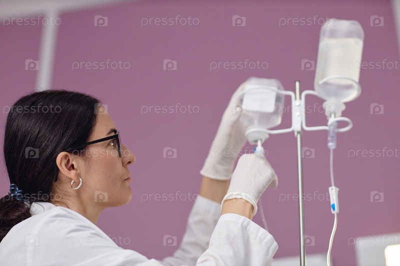 Молодая взрослая женщина, регулирующая IV-капельку в установке сосудистого центра