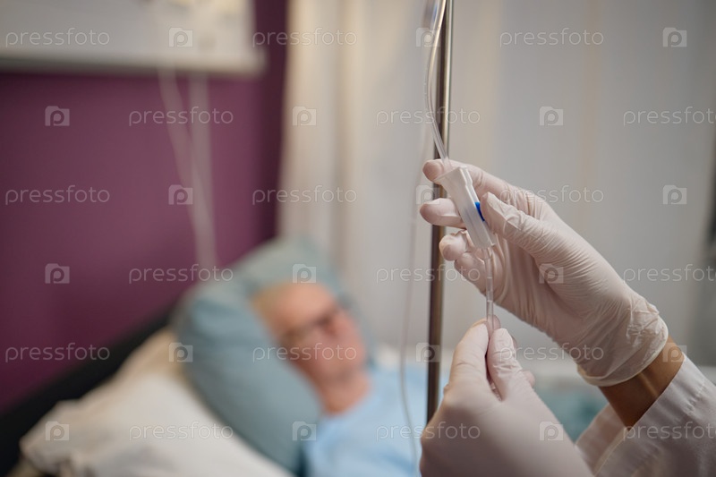 Пожилой мужчина лежит в больничной постели, получая внутривенную терапию