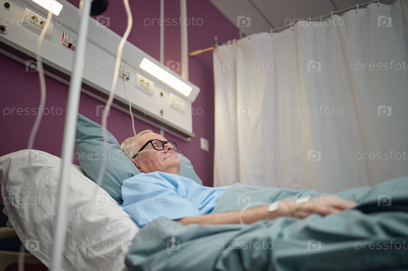 Пожилой мужчина отдыхает в больничной постели, получая лечение сосудистой системы
