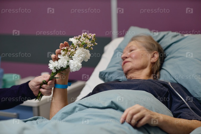 Пожилая женщина получает цветы, отдыхая в больничной постели