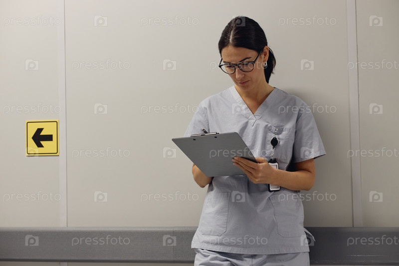 Молодая взрослая женщина медсестра рассматривает диаграмму пациентов в коридоре сосудистого центра