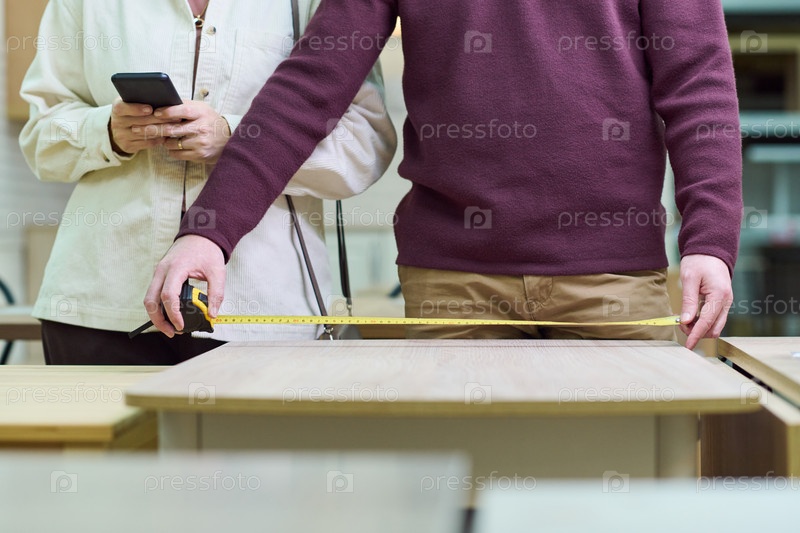 Мужчина измеряет стол, в то время как женщина держит смартфон