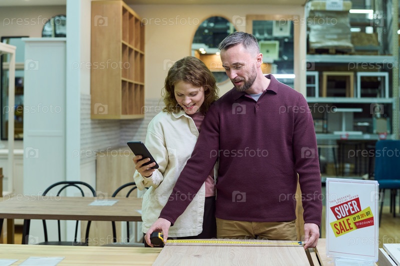 Молодая взрослая пара измеряет деревянный стол во время покупок в мебельном магазине