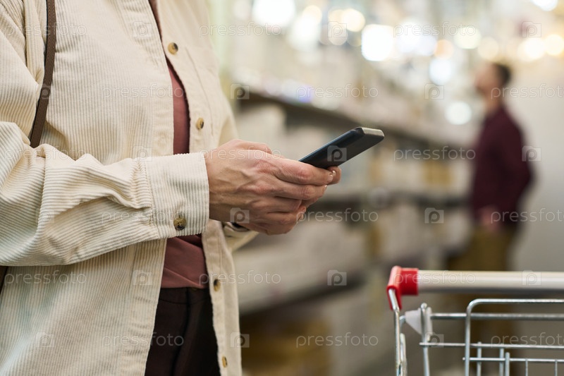 Женщина, использующая смартфон во время покупок в магазине