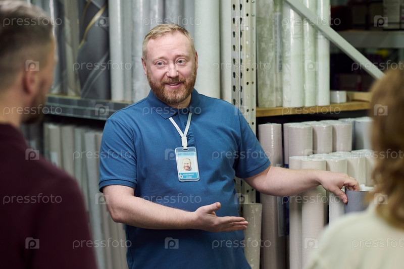 Продавец объясняет выбор обоев клиентам в магазине