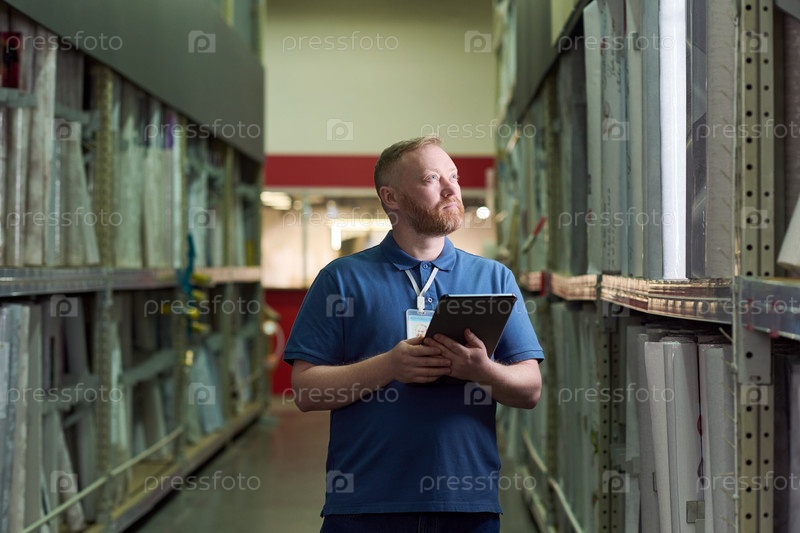 Человек, проверяющий инвентарь с помощью цифрового планшета в складе