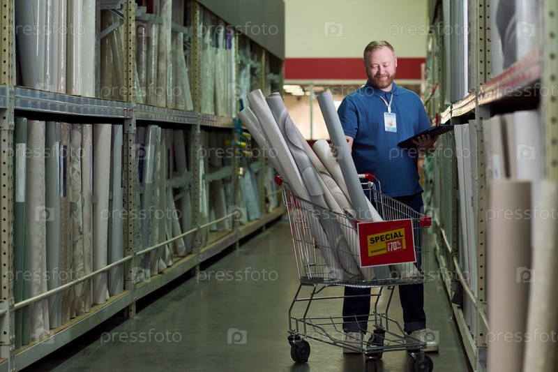 Человек, инспектирующий роллы ткани в проходе хранилища