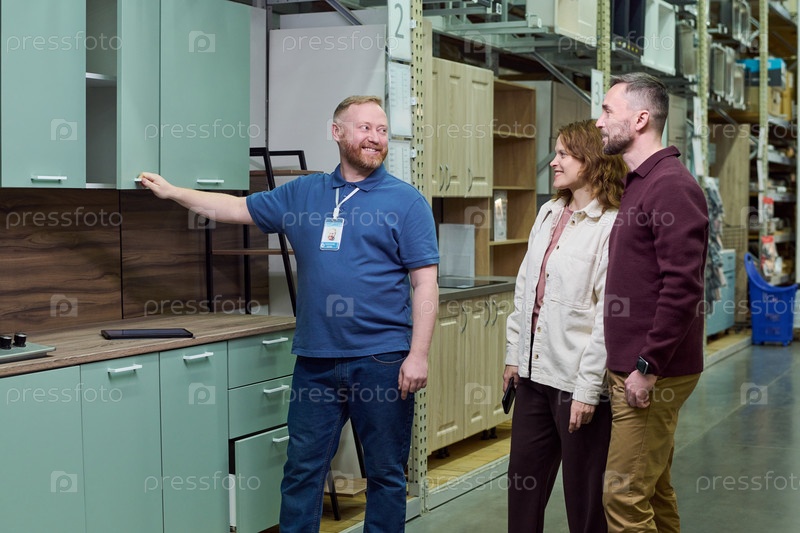 Продавец показывает кухонные шкафы молодой взрослой паре