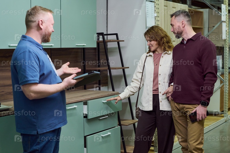 Молодая пара консультирует продавца при выборе кухонных шкафов