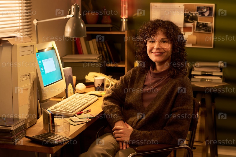 Портрет белокожей женщины, улыбающейся, сидящей за рабочим столом