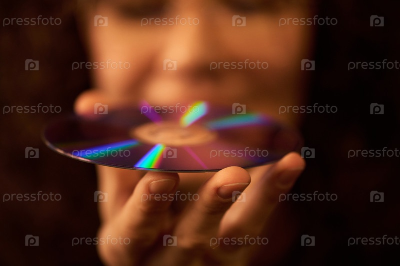 Кавказская молодая взрослая женщина держит компактный диск с отраженным светом