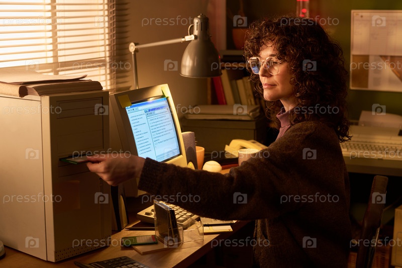 Кавказская женщина использует старый компьютер и вставляет дискету