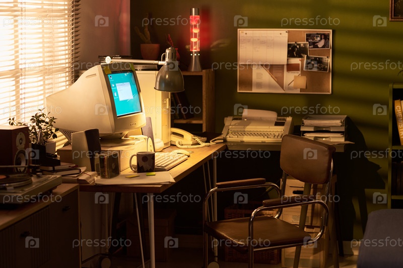 Винтажный настольный компьютер и офисное оборудование освещающее ретро домашнее рабочее пространство