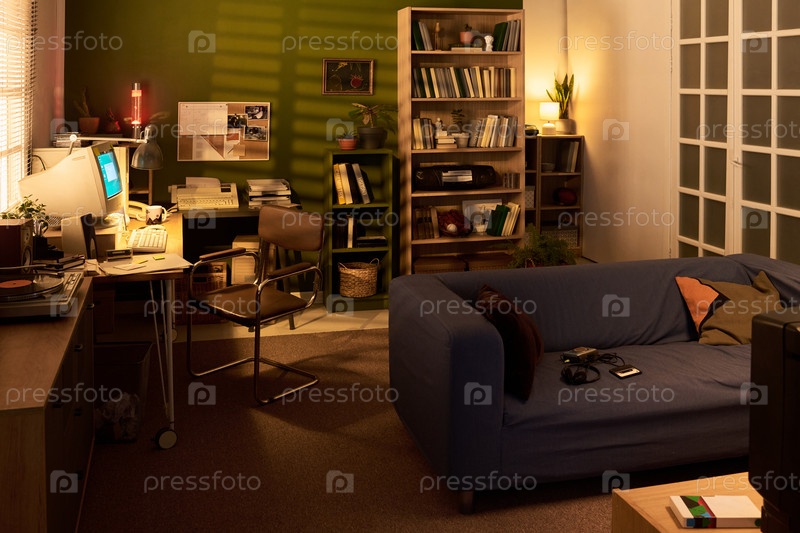 Пустая уютная гостиная с винтажным компьютерным столом и книжными полками в Sunset