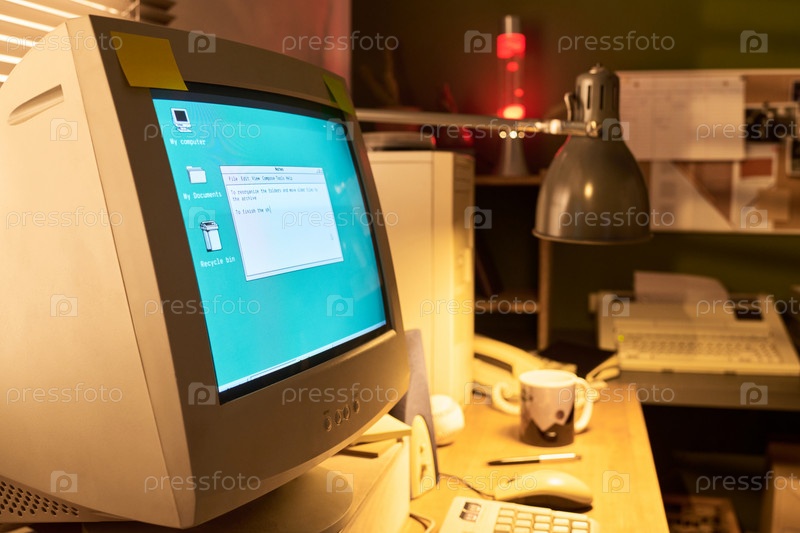 Компьютерный монитор отображает настольный экран в старых ретро-офисных настройках
