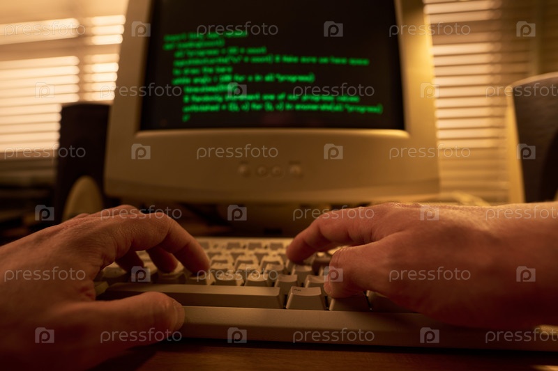 Человек, печатающий код на компьютерной клавиатуре в офисной обстановке