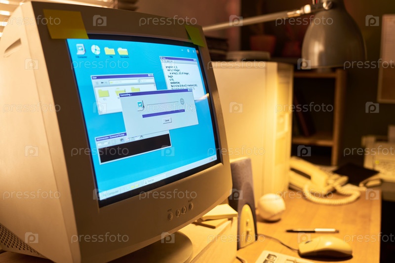 Компьютерный монитор отображает прогресс передачи файлов в старой конфигурации офиса