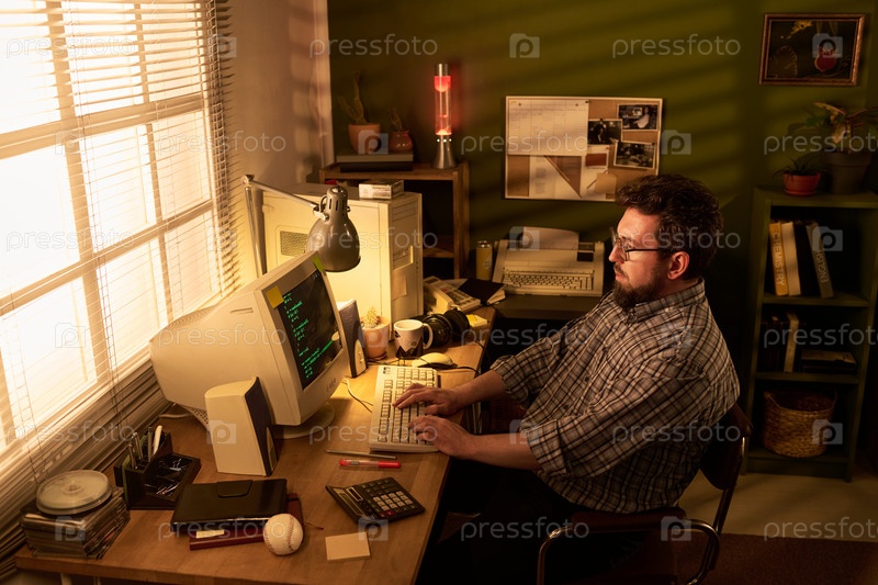 Кавказский мужчина работает на старинном компьютере в домашней офисной обстановке