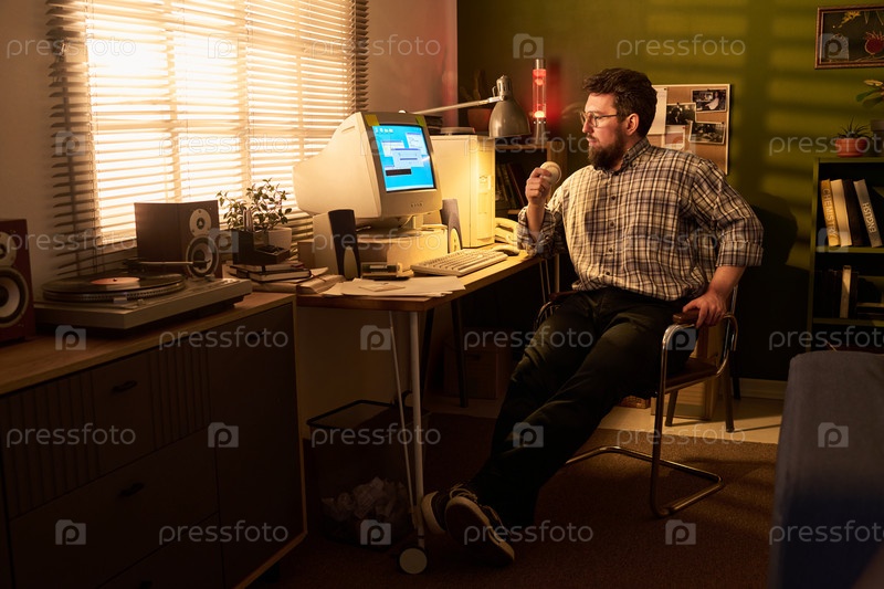 Кавказский мужчина использует старый компьютер, сидя в домашнем офисе