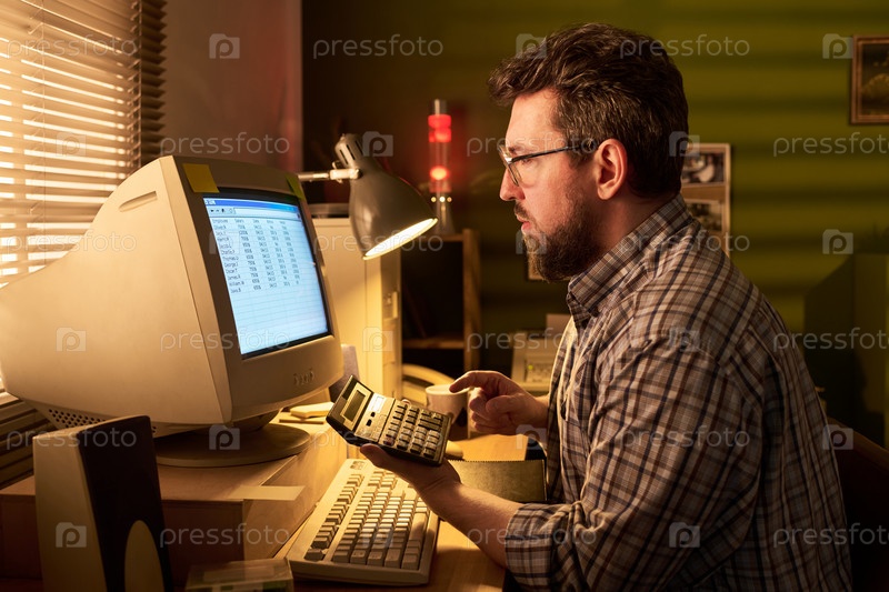 Кавказский мужчина использует калькулятор, работая на настольном компьютере