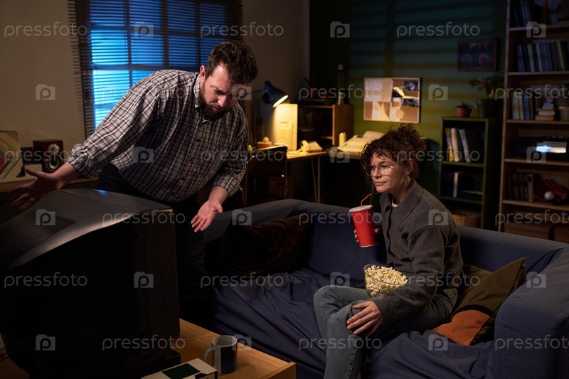 Белый мужчина объясняет женщине проблему с телевизором