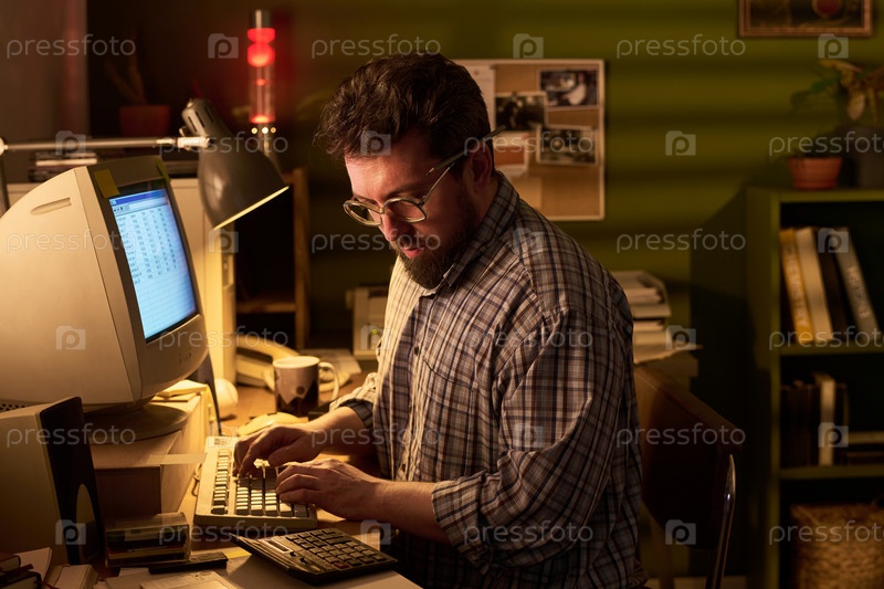 Белый мужчина работает на компьютере в слабо освещенном домашнем офисе