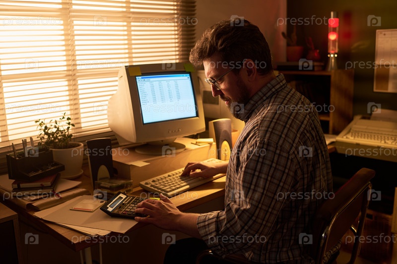 Белый мужчина работает с калькулятором и компьютером в офисе