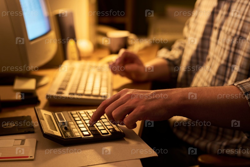 Человек, использующий калькулятор во время работы за столом в офисе